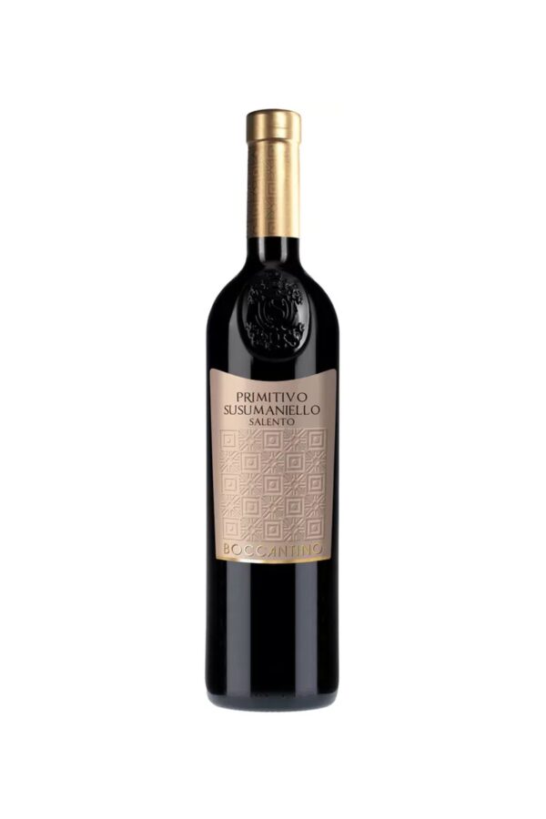 Włoskie czerwone wytrawne wino z regionu Apulia, stworzone z unikalnego połączenia szczepów Primitivo i Susumaniello. Charakteryzuje się głębokim, ciemnoczerwonym kolorem z fioletowymi refleksami oraz intensywnym aromatem czerwonych owoców z pikantnymi nutami. W smaku jest pełne, ciepłe i harmonijne, z dobrze wyważoną strukturą. Częściowa fermentacja w stalowych zbiornikach oraz starzenie w dębowych beczkach dodają mu głębi i subtelnych akcentów dębowych.