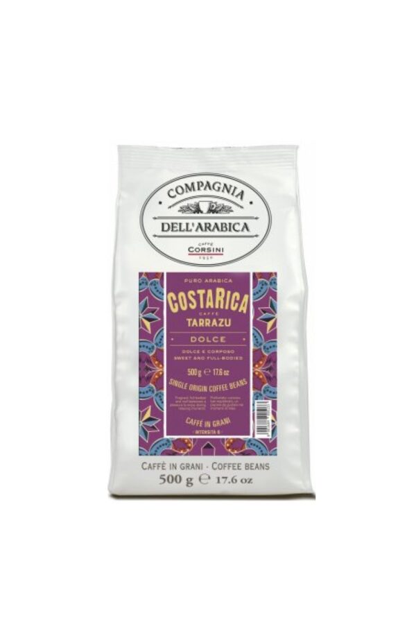 Wysokiej jakości kawa jednogatunkowa, na którą składają się wyłącznie najszlachetniejsze, średnio palone ziarna z gatunku Arabica (100%). Wykorzystana tu kostarykańska odmiana Tarrazu, już od XVIII w. uprawiana jest na żyznej glebie wulkanicznej, na plantacjach położonych na wysokości 1200-1700 m n.p.m. Za sprawą optymalnych warunków klimatycznych i odpowiedniemu przetwarzaniu, charakteryzuje się ona łagodnym aromatem, a także przejrzystym, słodkim smakiem o małej kwaskowatości oraz wspaniałym, pełnym body. Świetnie zbalansowana kawa Corsini Compagnia Dell’Arabica Costa Rica to gwarancja wspaniałych i intensywnych doznań zmysłowych.